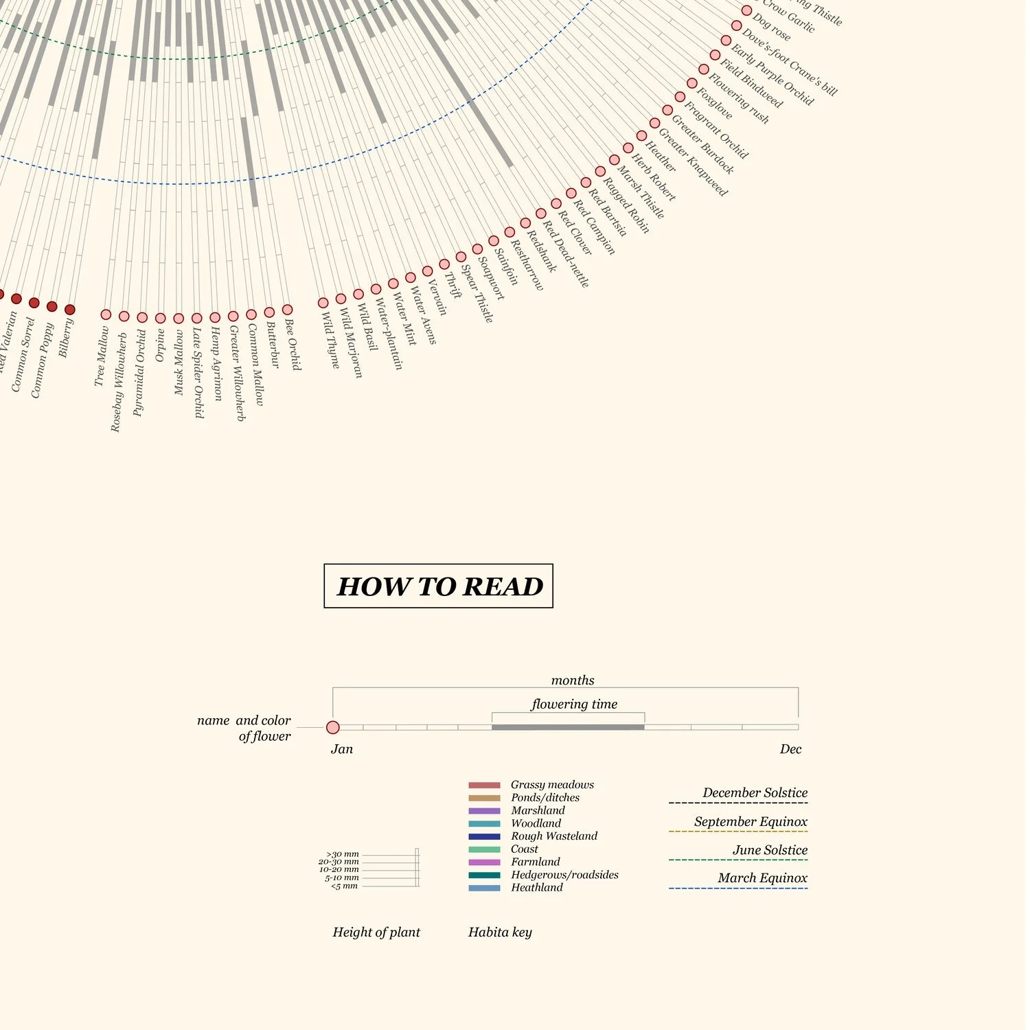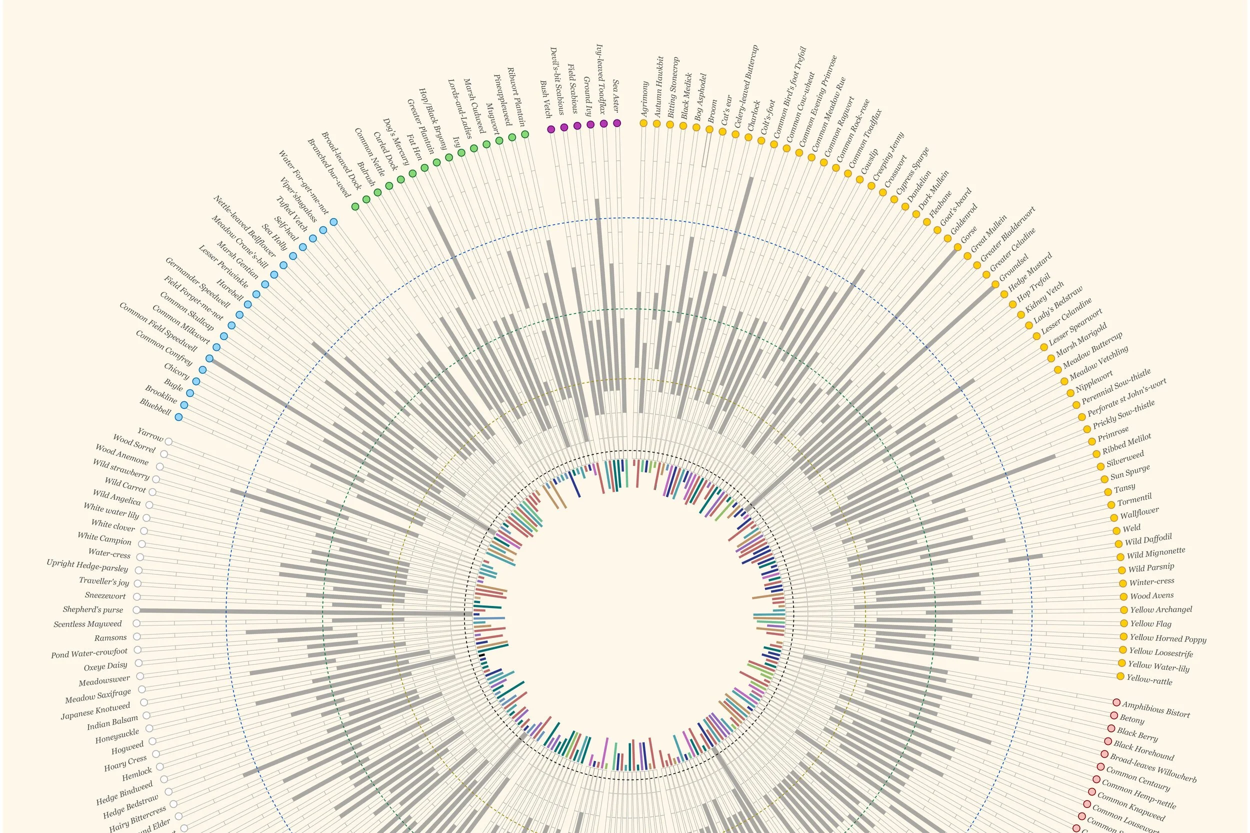 The summer in Finland is too short for any plant to grow, summer months in Nordic countries only last for about 3 months, approximately 100 days. Inspired by the book of Neil Fletcher, I want to make a data visualization about plant and their blooming times in Europe. The plants were divided to color groups, which represent color dots for each one, and the height of the plants getting along with colors in the smaller circle represents their habitat keys.